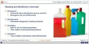 The course covers food handling procedures, cross-contamination prevention, temperature control, cleaning and disinfection, and legal responsibilities related to food safety.